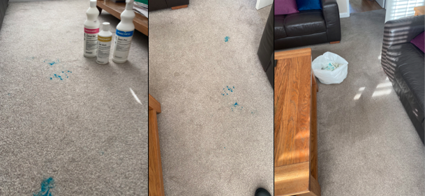 When Bertie the dog chewed the ink pen then walked it through house, with our professional spot stain removal training and professional products we managed to remove all evidence.